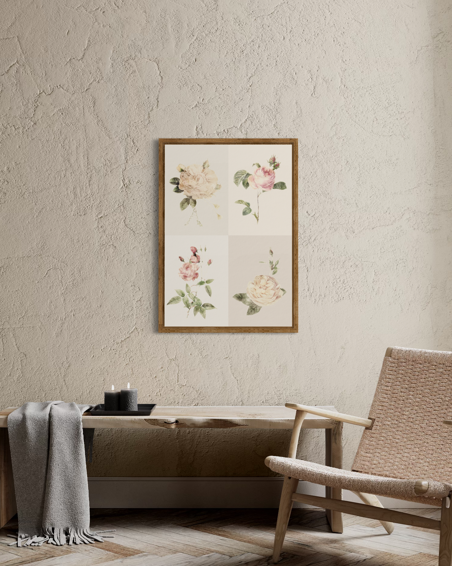 Vintage akvarell illustration av svagt rosa och vita rosor mot en rutig bakgrund i fyra olika nyanser av beige färg. Denna poster passar både det moderna och det klassiska hemmet tack vare sina neutrala färger och tidlösa motiv!